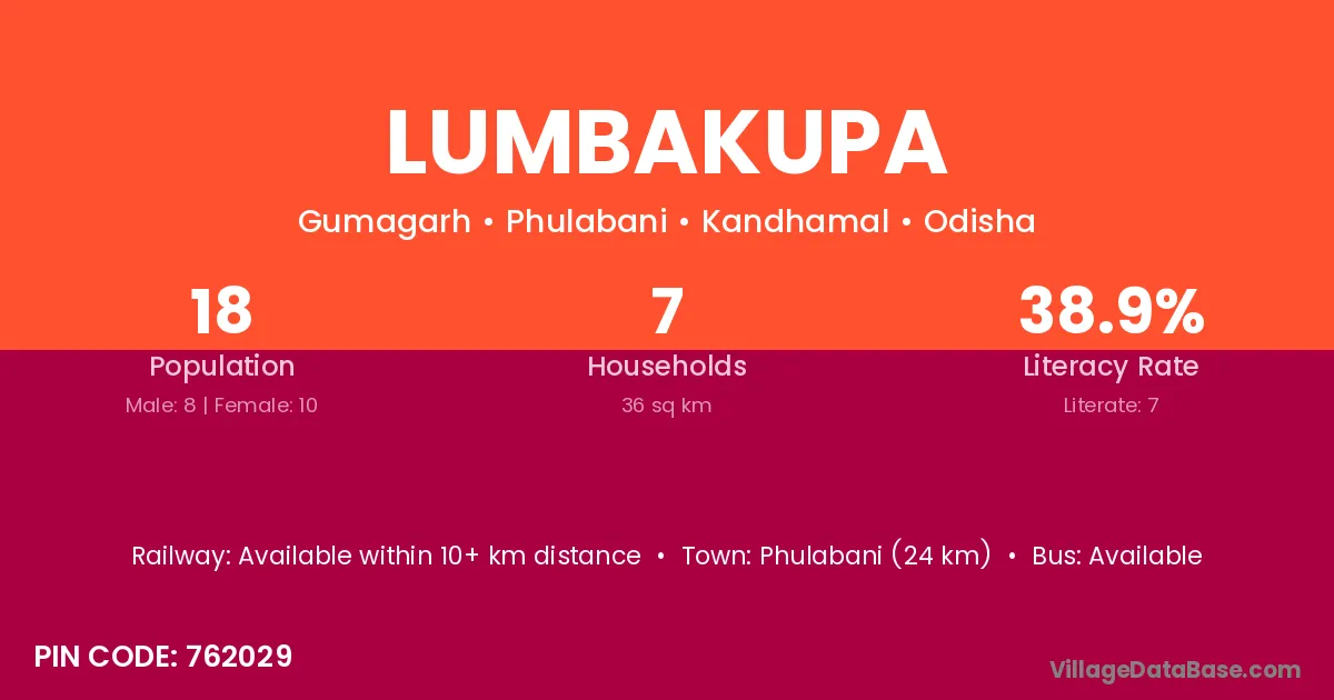 Phulabani (24 km) is the nearest town to Lumbakupa village for major economic activities and is located approximately 24 km away.