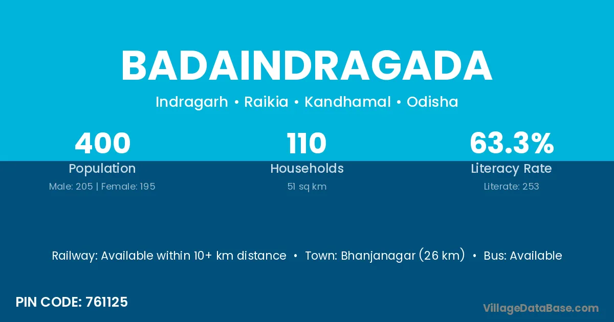 Bhanjanagar (26 km) is the nearest town to Badaindragada village for major economic activities and is located approximately 26 km away.