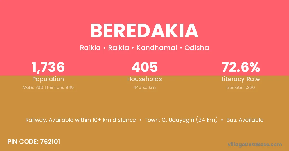 G. Udayagiri (24 km) is the nearest town to Beredakia village for major economic activities and is located approximately 24 km away.