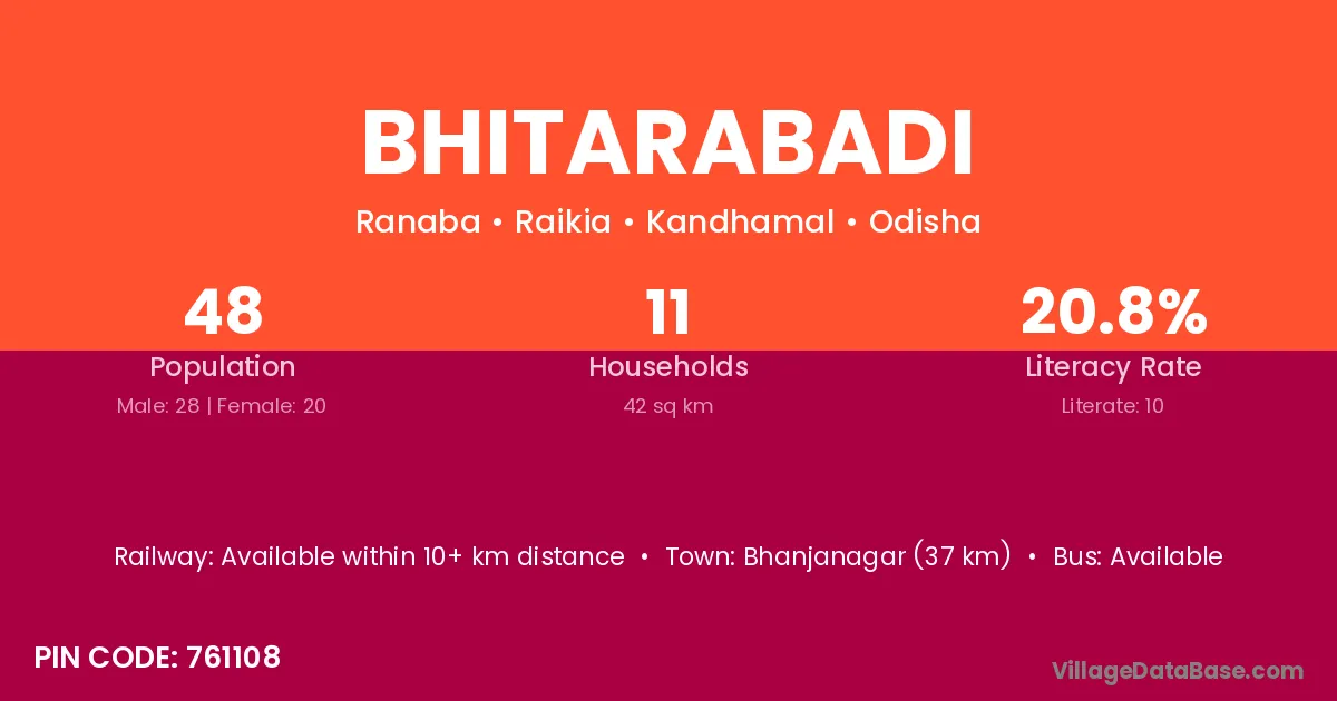 Bhanjanagar (37 km) is the nearest town to Bhitarabadi village for major economic activities and is located approximately 37 km away.