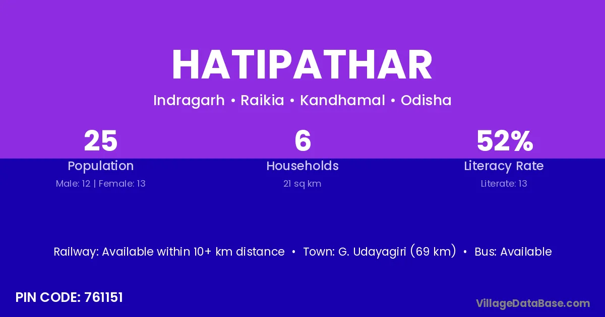 G. Udayagiri (69 km) is the nearest town to Hatipathar village for major economic activities and is located approximately 69 km away.
