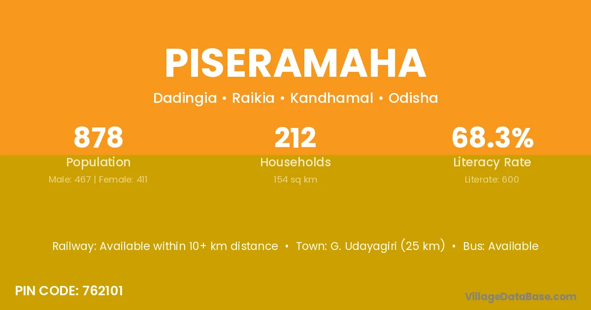 G. Udayagiri (25 km) is the nearest town to Piseramaha village for major economic activities and is located approximately 25 km away.