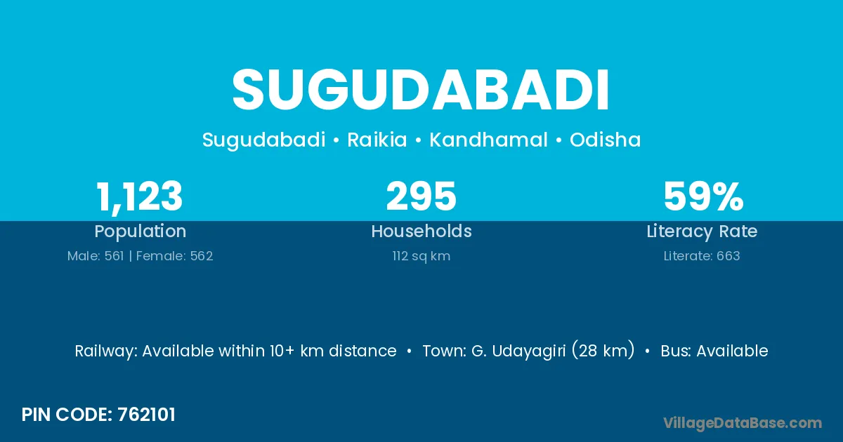 Sugudabadi village has a total population of 1,123 people, of which 561 are males and 562 are females.
