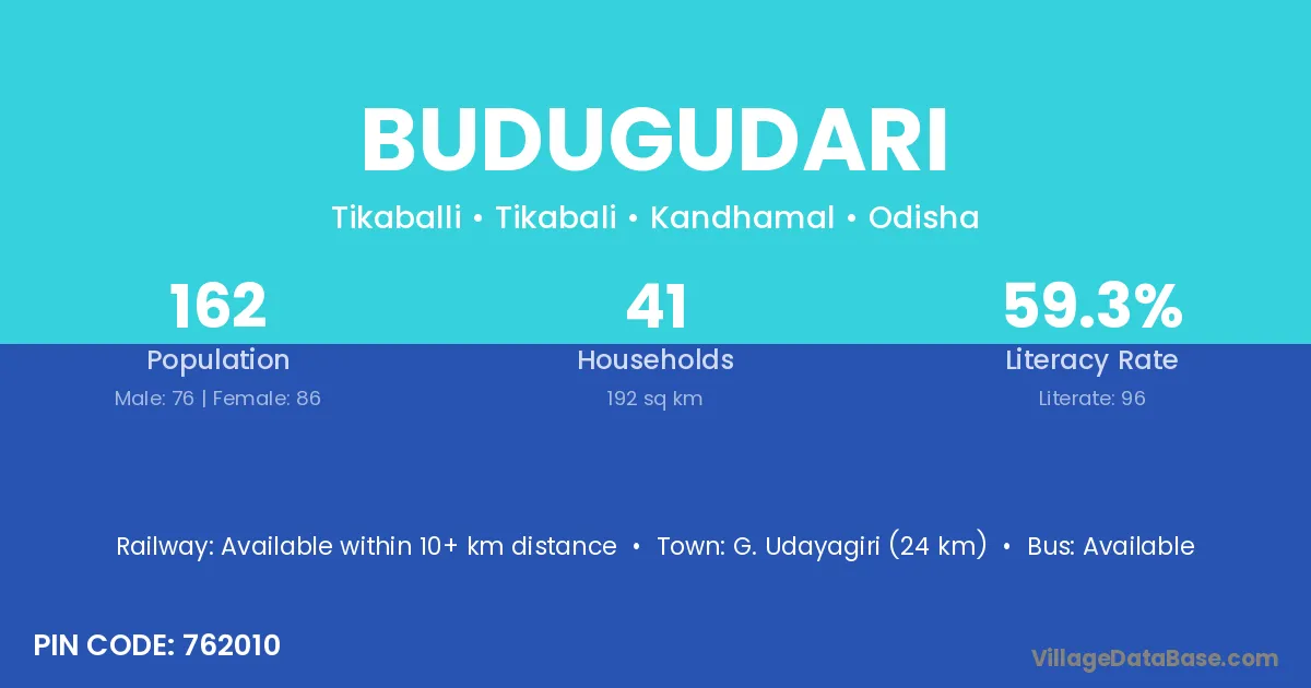 G. Udayagiri (24 km) is the nearest town to Budugudari village for major economic activities and is located approximately 24 km away.