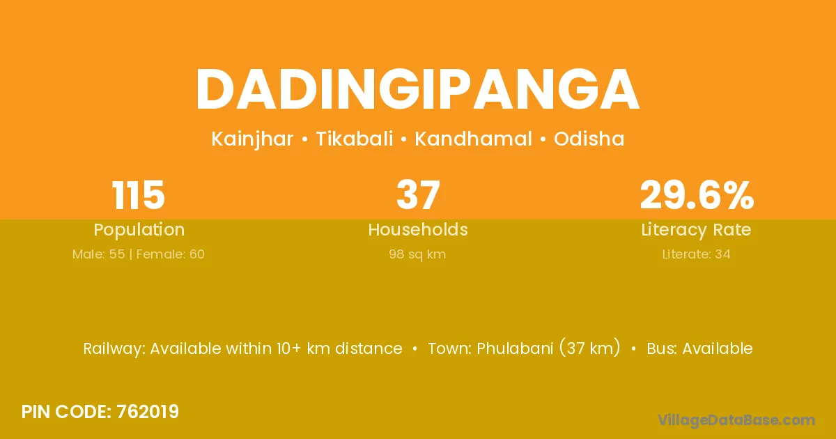 Phulabani (37 km) is the nearest town to Dadingipanga village for major economic activities and is located approximately 37 km away.