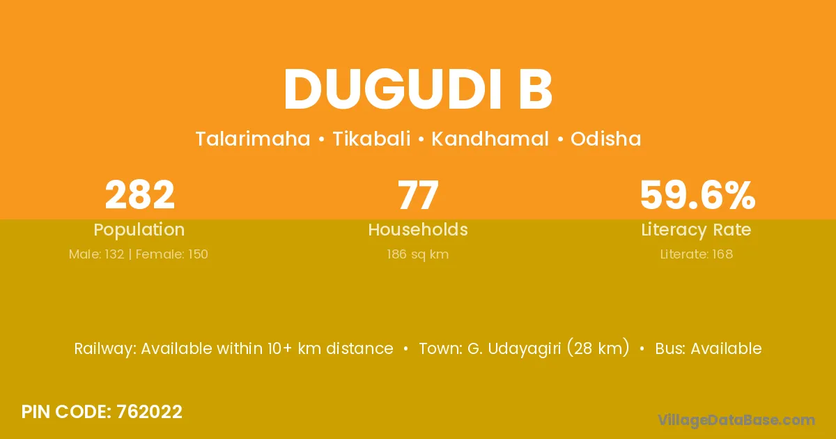 G. Udayagiri (28 km) is the nearest town to Dugudi B village for major economic activities and is located approximately 28 km away.