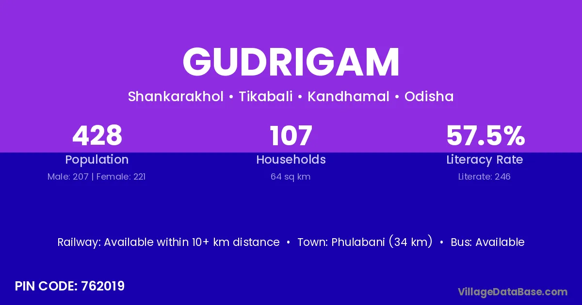 Phulabani (34 km) is the nearest town to Gudrigam village for major economic activities and is located approximately 34 km away.