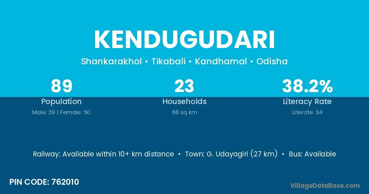 Kendugudari village has a total population of 89 people, of which 39 are males and 50 are females.