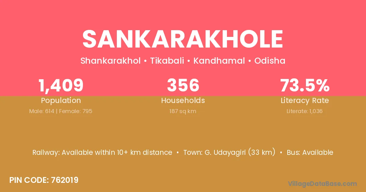 Sankarakhole village has a total population of 1,409 people, of which 614 are males and 795 are females.