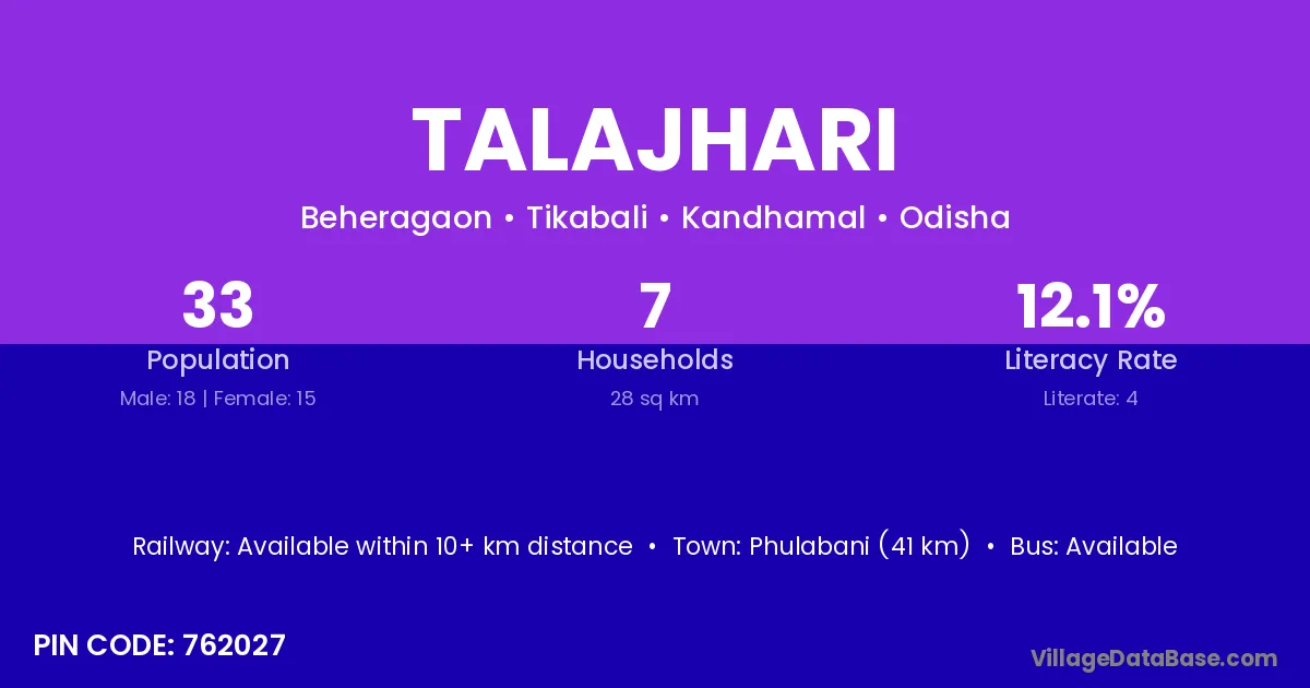 Phulabani (41 km) is the nearest town to Talajhari village for major economic activities and is located approximately 41 km away.