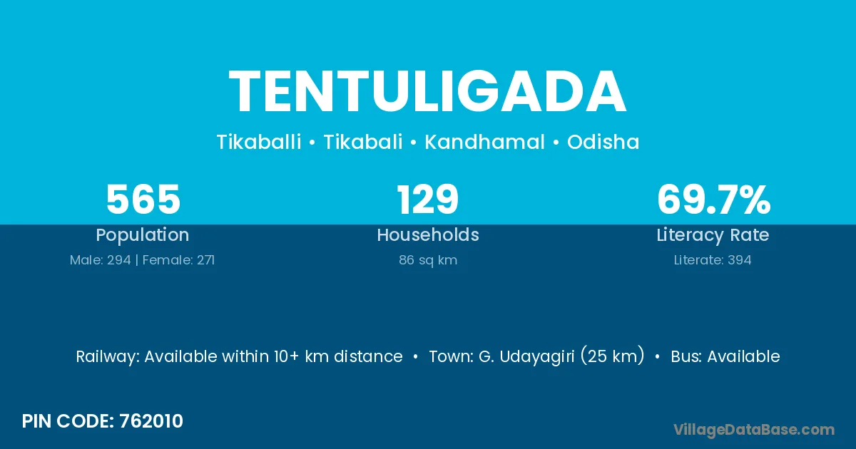 Tentuligada village has a total population of 565 people, of which 294 are males and 271 are females.