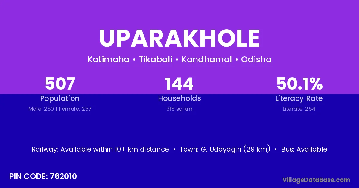 Uparakhole village has a total population of 507 people, of which 250 are males and 257 are females.