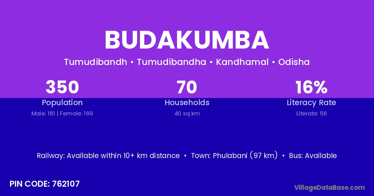 Phulabani (97 km) is the nearest town to Budakumba village for major economic activities and is located approximately 97 km away.