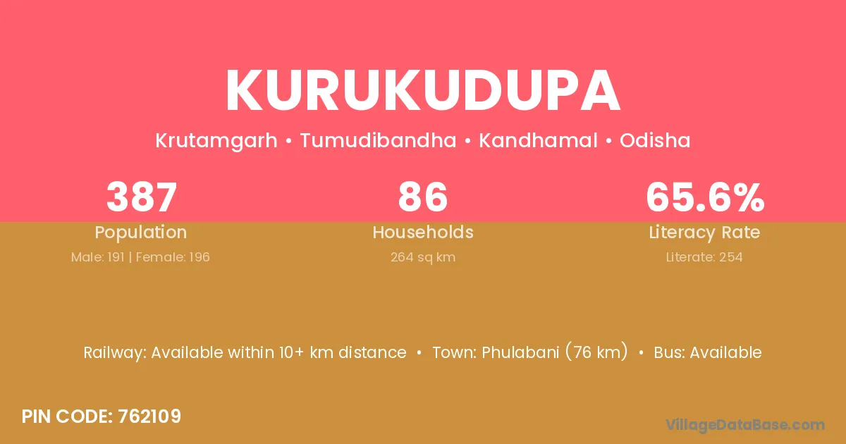 Phulabani (76 km) is the nearest town to Kurukudupa village for major economic activities and is located approximately 76 km away.