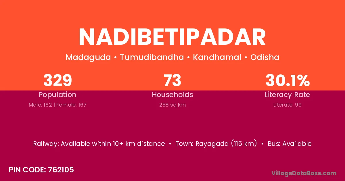 Rayagada (115 km) is the nearest town to Nadibetipadar village for major economic activities and is located approximately 115 km away.