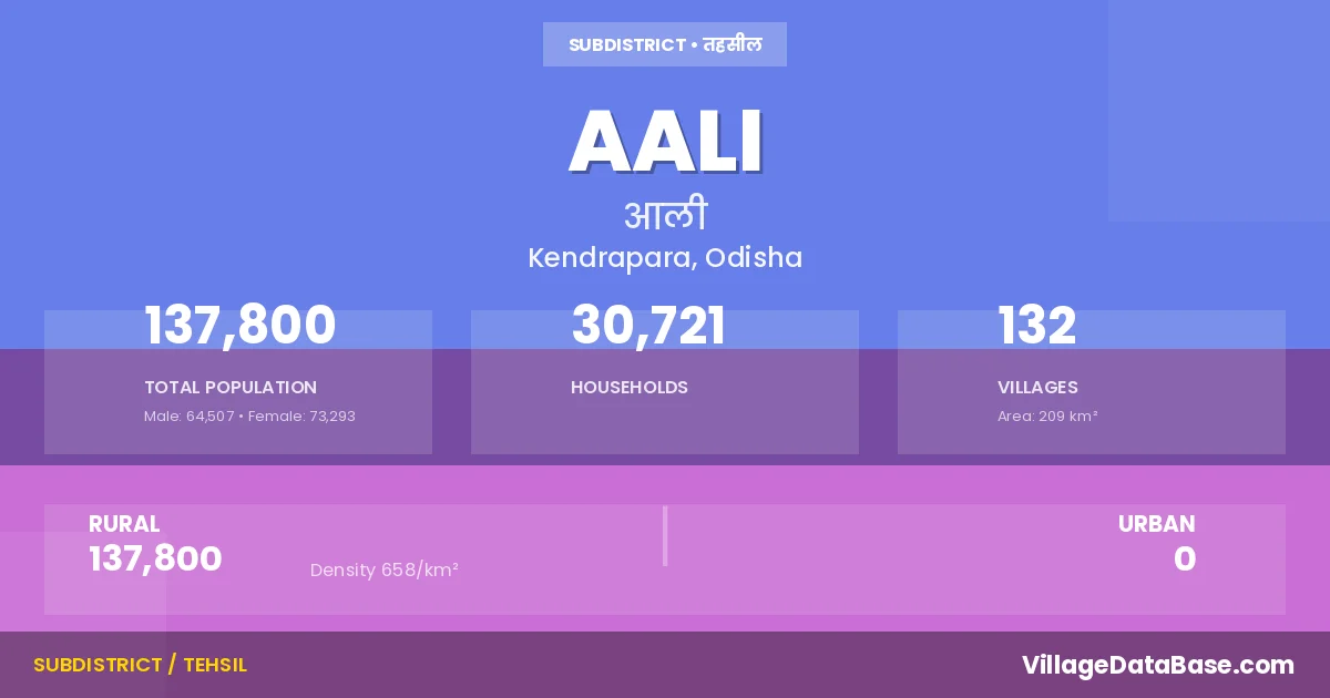Aali is a town and Tehsil in the Kendrapara district of the Odisha. In India, a Tehsil is a subdivision of a district responsible for the administration and revenue collection of a specific area within the district. Tehsils play a crucial role in the local governance structure, contributing significantly to the development and administration of their communities.