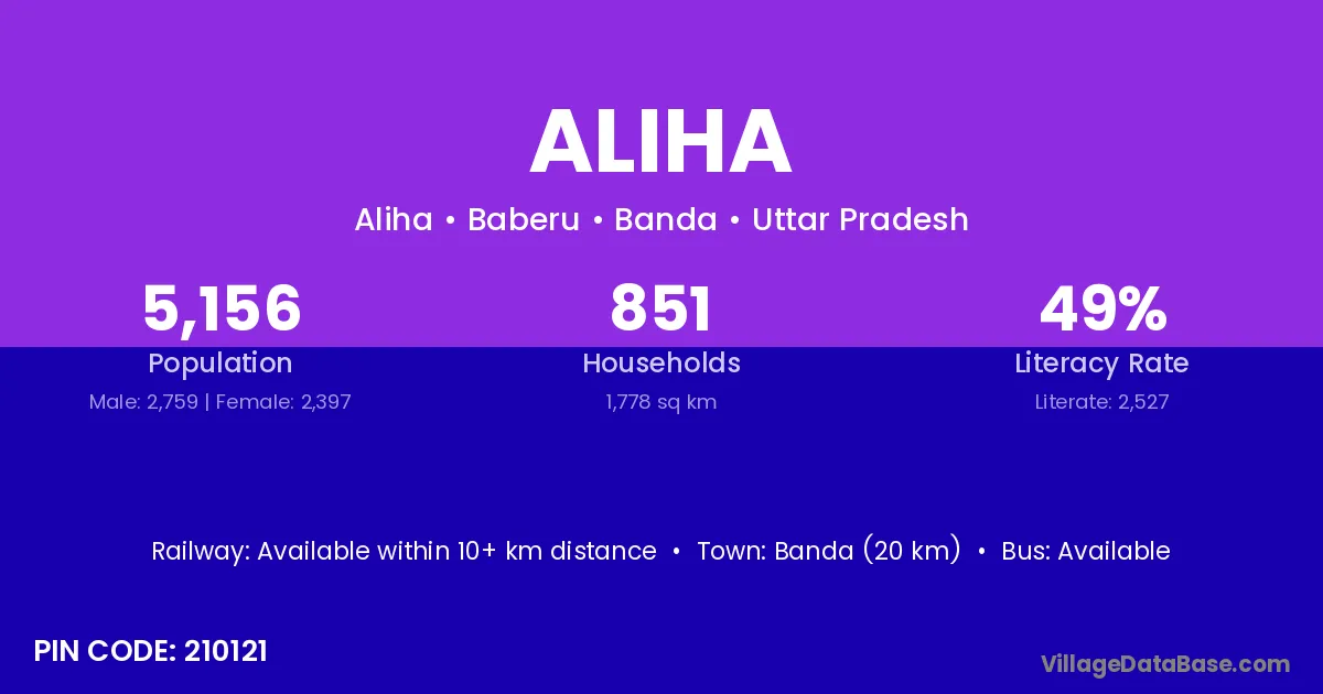 The literacy rate of Aliha village is 76.47%. Male literacy stands at 84.87% and female literacy at 68.62%.