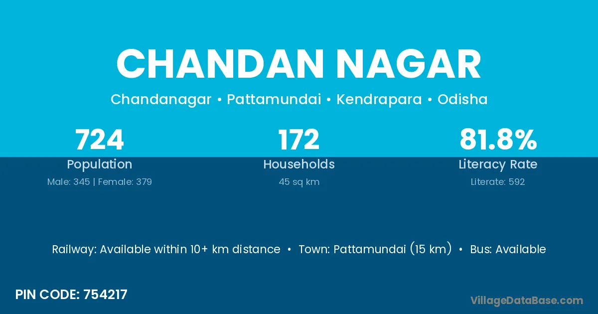 Pattamundai (25 km) is the nearest town to Chandan Nagar village for major economic activities and is located approximately 25 km away.