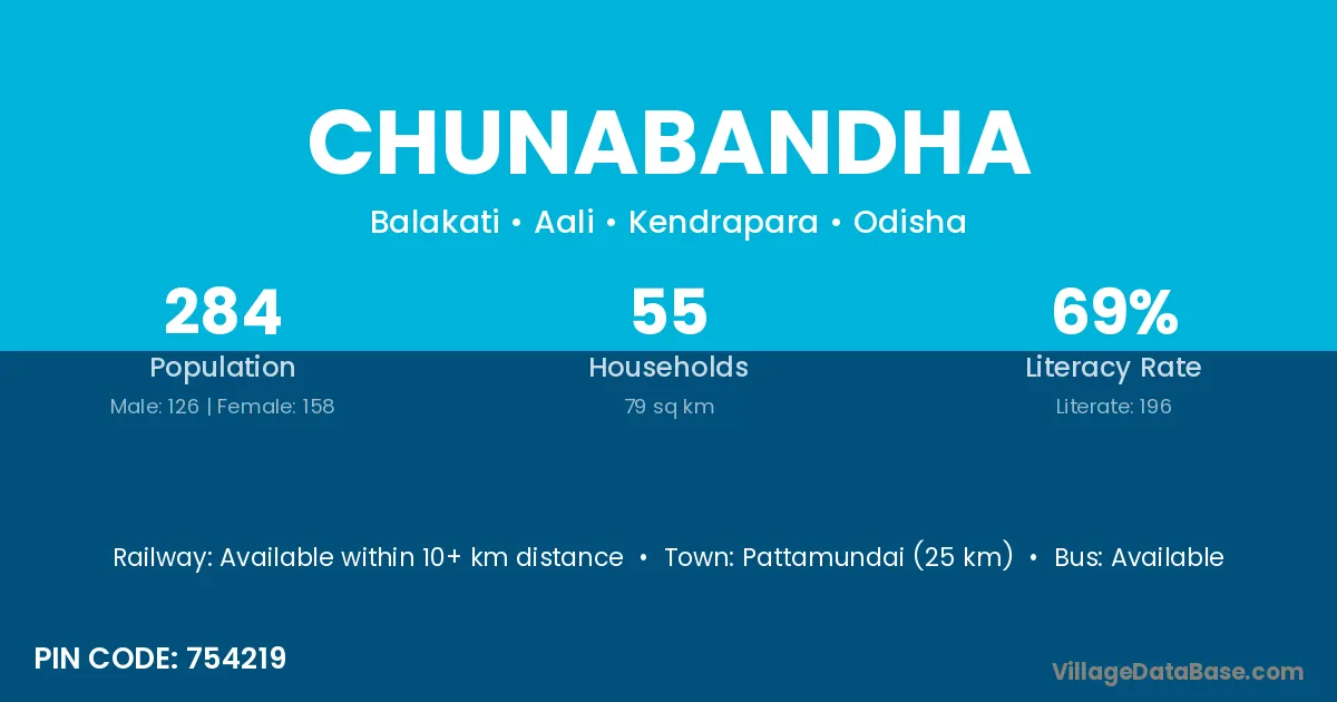 Pattamundai (25 km) is the nearest town to Chunabandha village for major economic activities and is located approximately 25 km away.