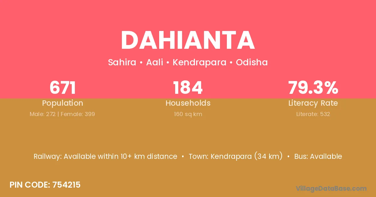 Kendrapara (34 km) is the nearest town to Dahianta village for major economic activities and is located approximately 34 km away.