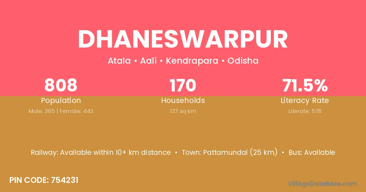 Pattamundai (25 km) is the nearest town to Dhaneswarpur village for major economic activities and is located approximately 25 km away.