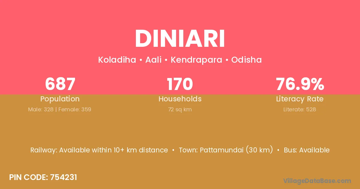 Pattamundai (30 km) is the nearest town to Diniari village for major economic activities and is located approximately 30 km away.