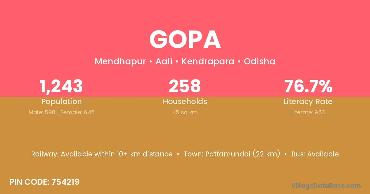 Pattamundai (22 km) is the nearest town to Gopa village for major economic activities and is located approximately 22 km away.