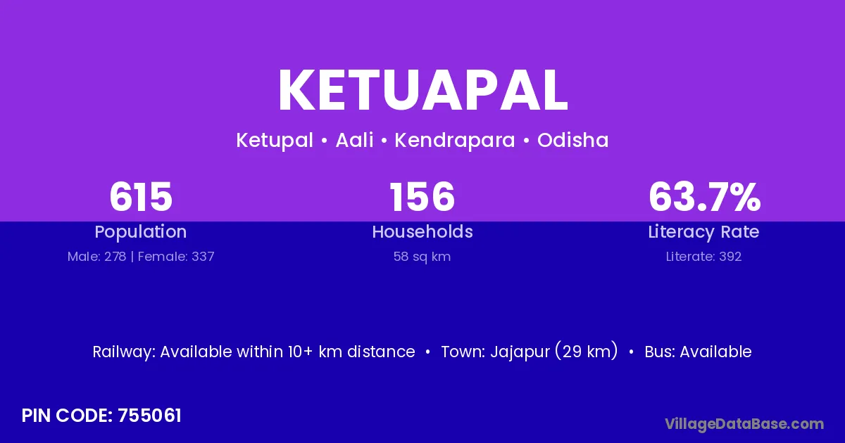 Jajapur (29 km) is the nearest town to Ketuapal village for major economic activities and is located approximately 29 km away.