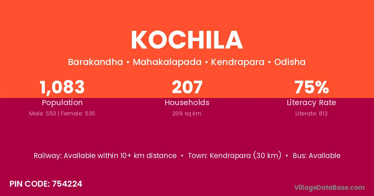Pattamundai (25 km) is the nearest town to Kochila village for major economic activities and is located approximately 25 km away.