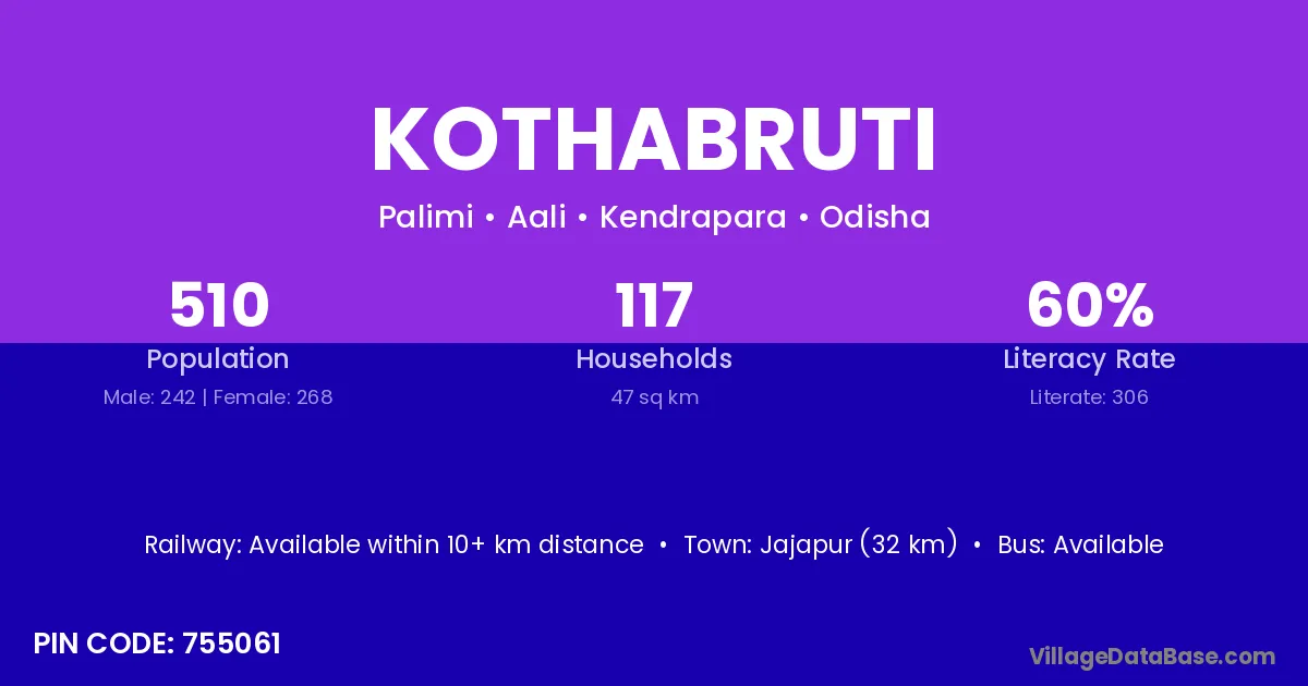 Kothabruti village has a total population of 510 people, of which 242 are males and 268 are females.