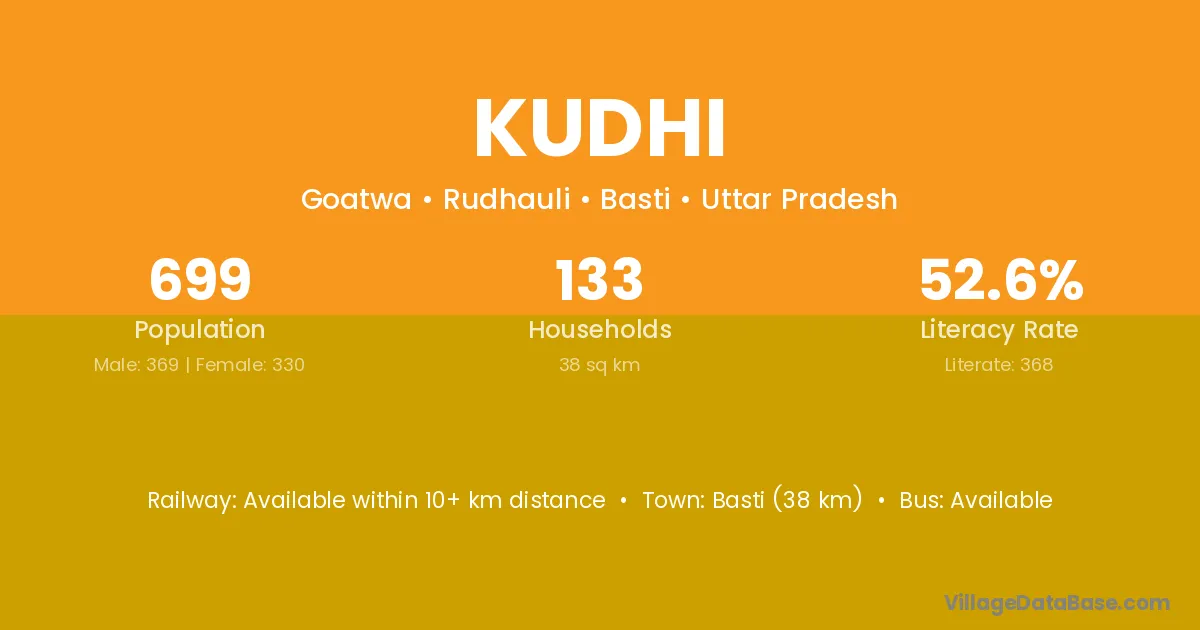 The literacy rate of Kudhi village is 75.66%. Male literacy stands at 85.97% and female literacy at 65.05%.