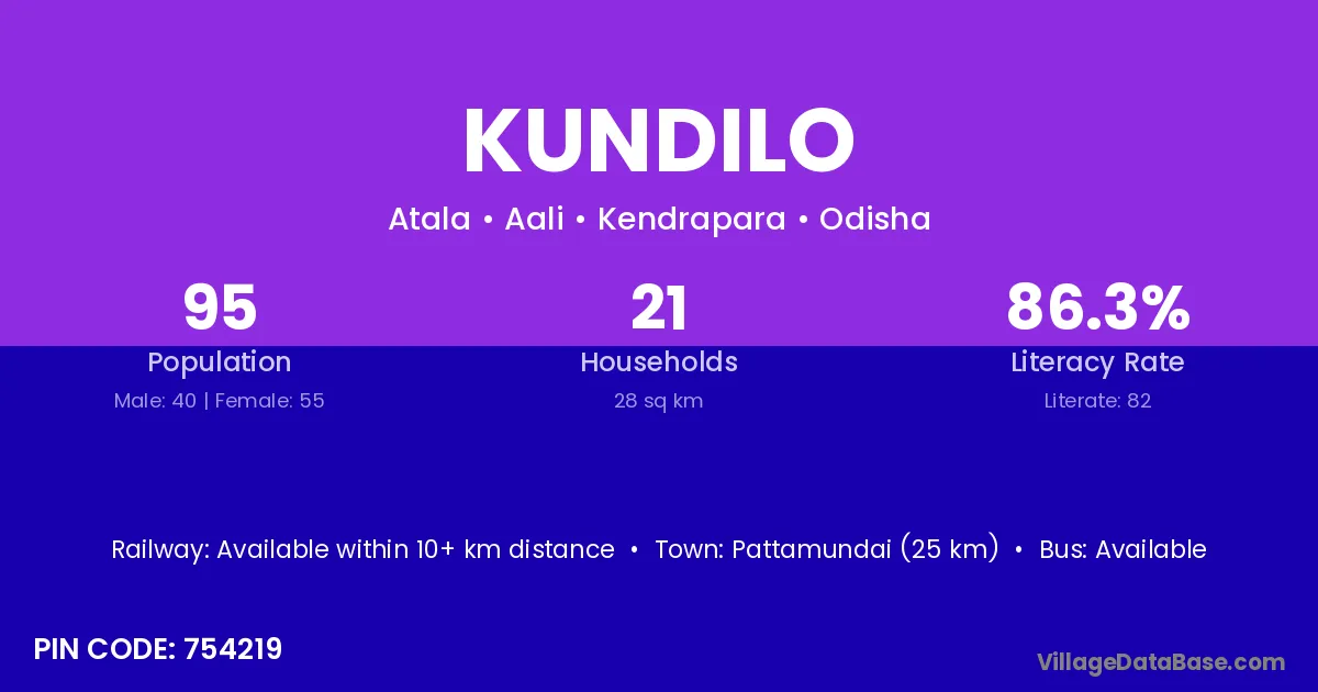 Pattamundai (25 km) is the nearest town to Kundilo village for major economic activities and is located approximately 25 km away.