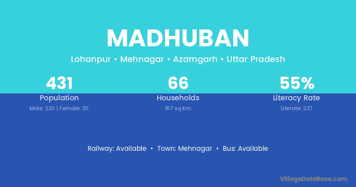 Madhuban village has a total population of 3,192 people, of which 1,431 are males and 1,761 are females.