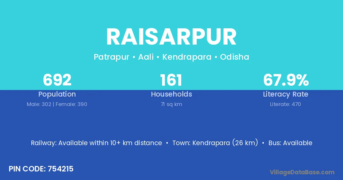 Kendrapara (26 km) is the nearest town to Raisarpur village for major economic activities and is located approximately 26 km away.