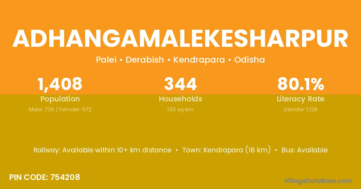 Kendrapara (16 km) is the nearest town to Adhangamalekesharpur village for major economic activities and is located approximately 16 km away.