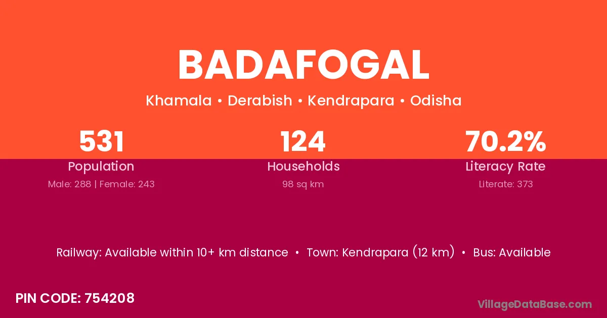 Kendrapara (12 km) is the nearest town to Badafogal village for major economic activities and is located approximately 12 km away.