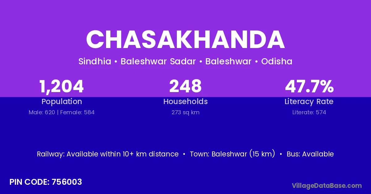 Kendrapara (16 km) is the nearest town to Chasakhanda village for major economic activities and is located approximately 16 km away.