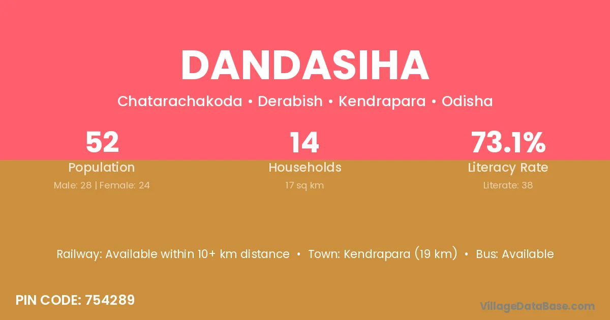 Kendrapara (19 km) is the nearest town to Dandasiha village for major economic activities and is located approximately 19 km away.