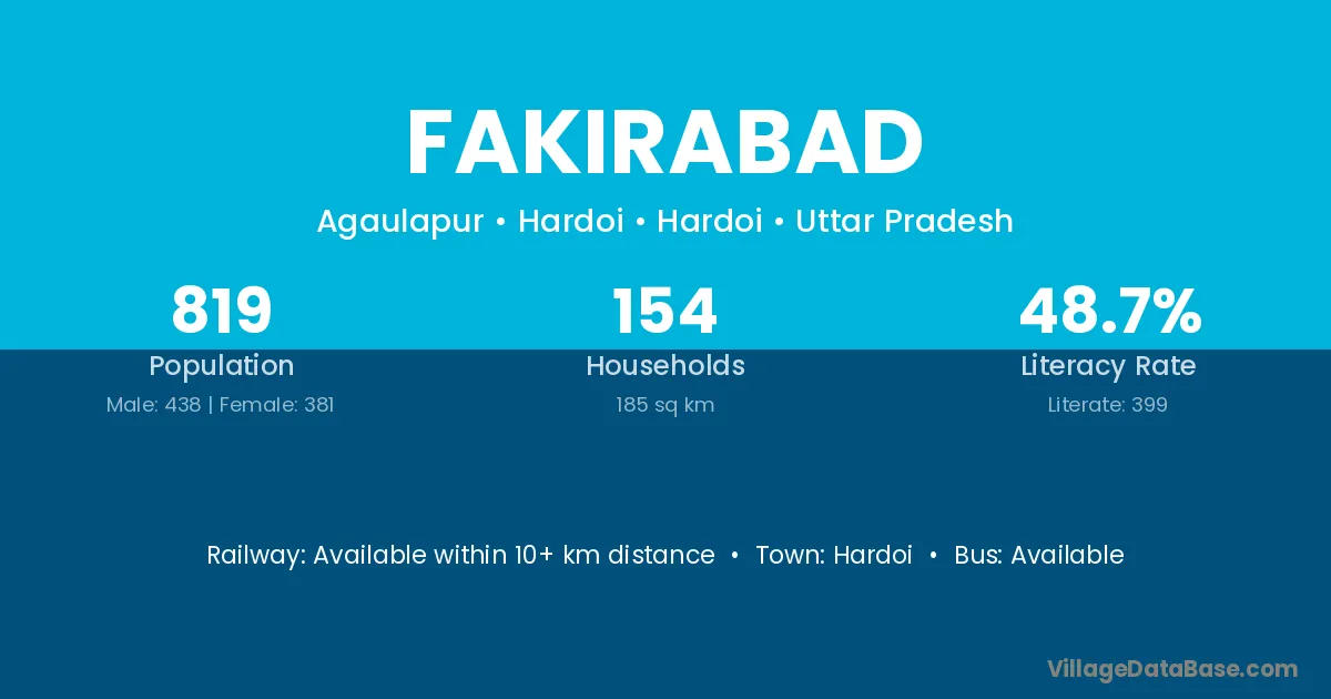The literacy rate of Fakirabad village is 75.69%. Male literacy stands at 80.90% and female literacy at 70.00%.