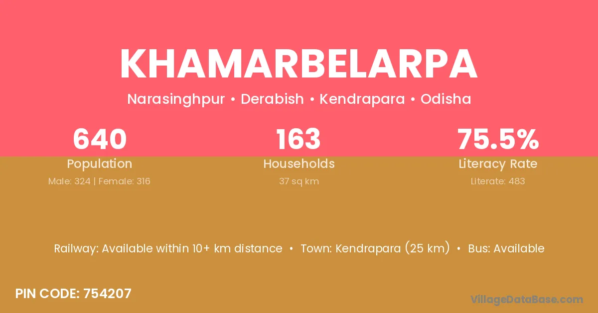 Kendrapara (25 km) is the nearest town to Khamarbelarpa village for major economic activities and is located approximately 25 km away.