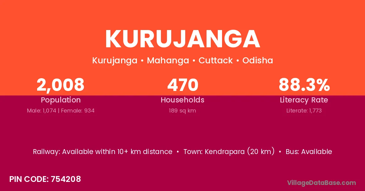 Kendrapara (20 km) is the nearest town to Kurujanga village for major economic activities and is located approximately 20 km away.