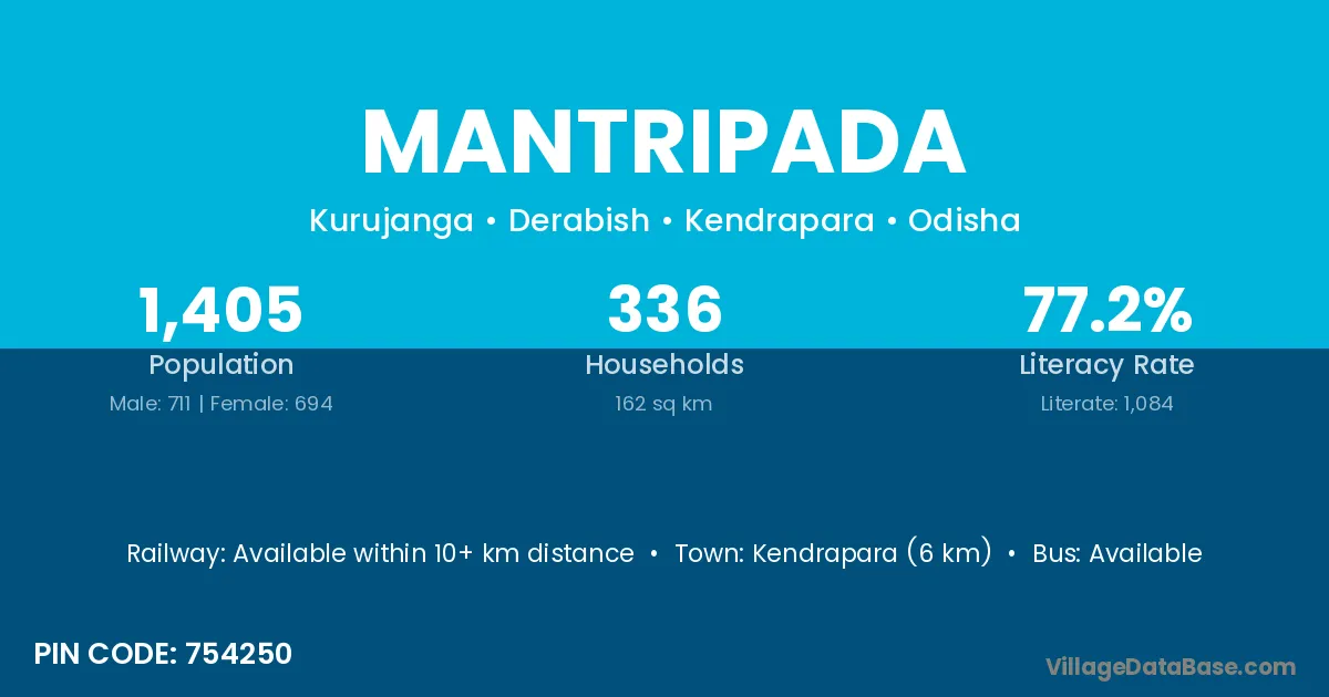 Kendrapara (6 km) is the nearest town to Mantripada village for major economic activities and is located approximately 6 km away.