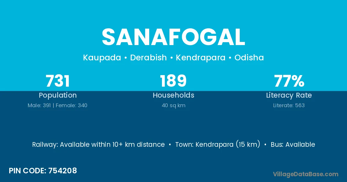 Kendrapara (15 km) is the nearest town to Sanafogal village for major economic activities and is located approximately 15 km away.