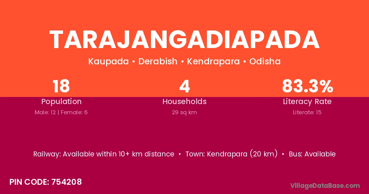 The literacy rate of Tarajangadiapada village is 83.33%. Male literacy stands at 91.67% and female literacy at 66.67%.
