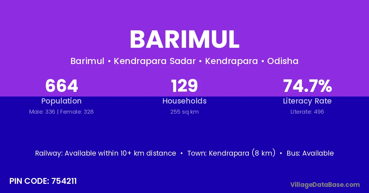 Kendrapara (8 km) is the nearest town to Barimul village for major economic activities and is located approximately 8 km away.