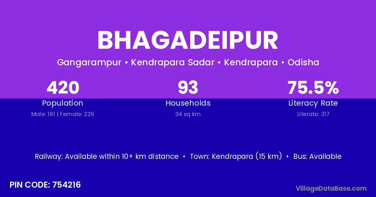 Kendrapara (15 km) is the nearest town to Bhagadeipur village for major economic activities and is located approximately 15 km away.