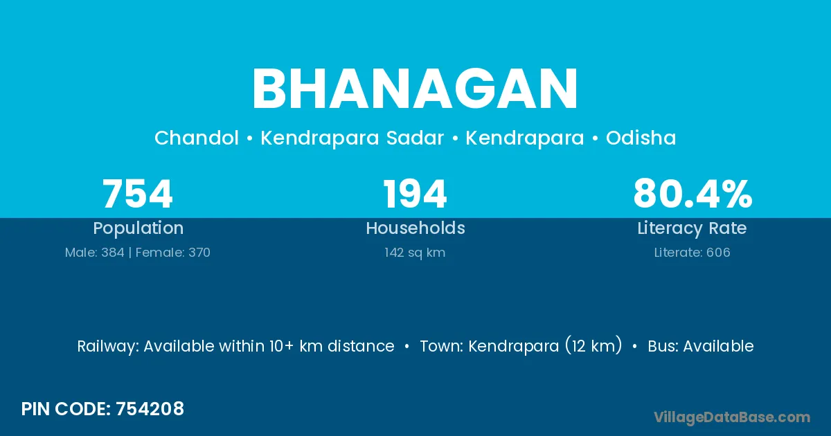 Kendrapara (12 km) is the nearest town to Bhanagan village for major economic activities and is located approximately 12 km away.