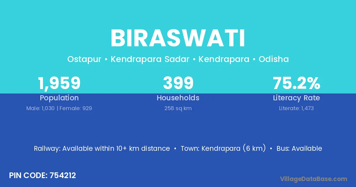 Kendrapara (6 km) is the nearest town to Biraswati village for major economic activities and is located approximately 6 km away.