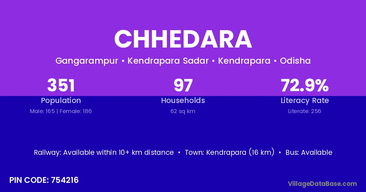 Kendrapara (16 km) is the nearest town to Chhedara village for major economic activities and is located approximately 16 km away.