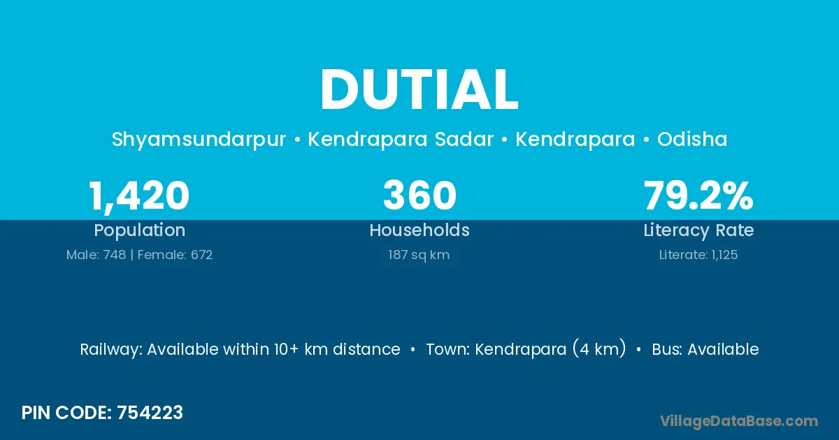 Kendrapara (4 km) is the nearest town to Dutial village for major economic activities and is located approximately 4 km away.